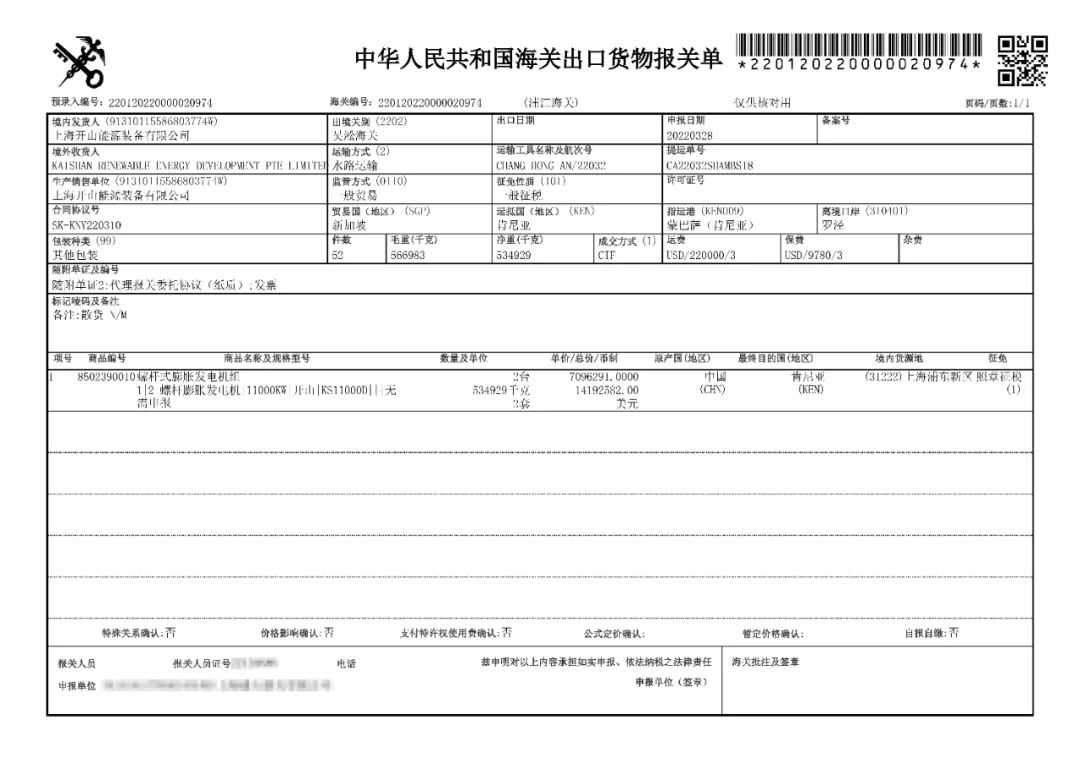 上周,肯尼亞Sosian地?zé)犭娬緝膳_(tái)螺桿蒸汽膨脹發(fā)電機(jī)組啟運(yùn)上海羅涇港。今天,完成海關(guān)報(bào)關(guān)作業(yè),不日就將裝船發(fā)運(yùn)肯尼亞蒙巴薩港。