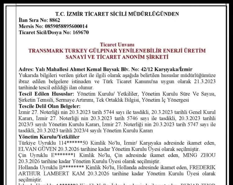 近日,開山集團股份有限公司的全資公司OME (Eurasia) Pte., Ltd.(以下簡稱“OME Eurasia”)與Sonsuz Enerji Holing B.V.(以下簡稱“Sonsuz”)已在伊茲密爾完成Transmark turkey Gulpinar Yenilenebilir Enerji Urtetim Sanayi(以下簡稱“TTG”)公司的股權變更手續,完成了OME Eurasia與Sonsuz此前簽署的《TTG公司股權認購暨股東協議》所規定的交割程序。TTG新股東結構及董事會成員已在土耳其工商機構進行登報。至此OME Eurasia已成為擁有TTG49%股份的股東,Sonsuz控股51%。